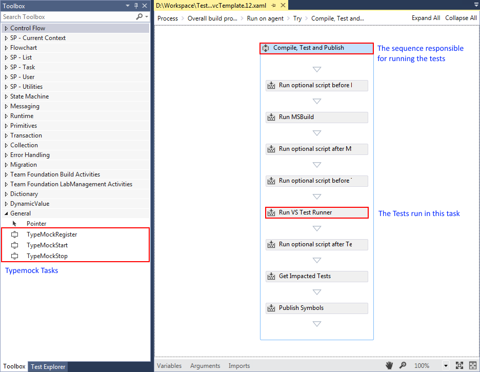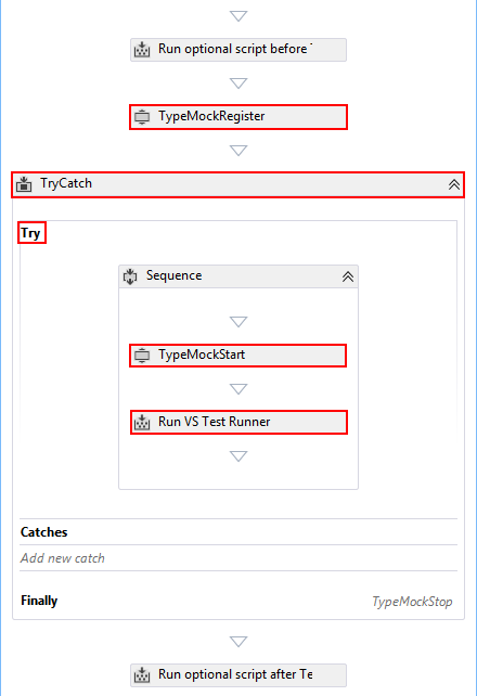 Drag a "Run VS Test Runner" control from the "Compile, Test and Publish" sequence and drop it inside the try block in TryCatch control after TypemockStart.