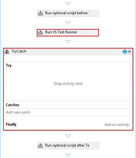 Drag a TryCatch control from the Toolbox and drop it after the "Run VS Test Runner" task.