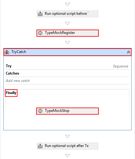 Drag a TypemockStart task from the Toolbox and drop it inside the try block in TryCatch control.