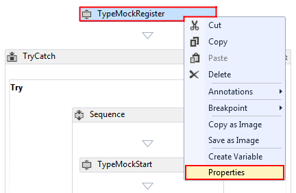 Drag a TypemockRegister task from the Toolbox and drop it before the TryCatch control.