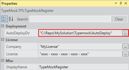 3. In the TypeMockRegister properties, set the AutoDeployDir property to the Source location.