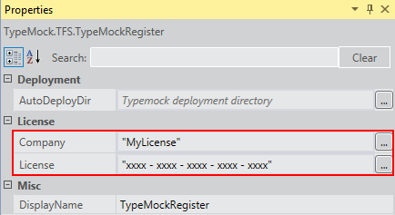 In the properties view fill in Typemock license details