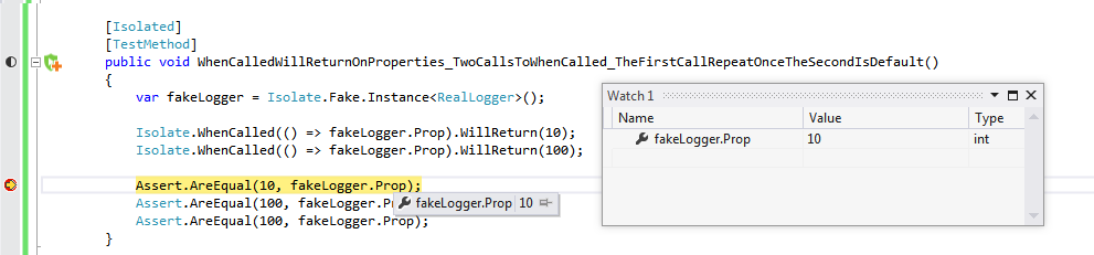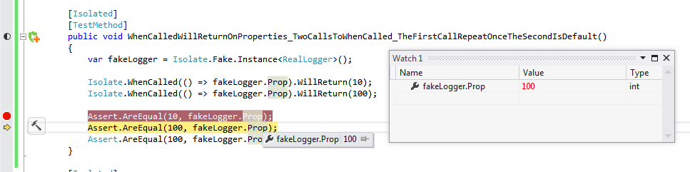 C# [Isolated] [TestMethod] public void WhenCalledWillReturnOnProperties_TwoCallsToWhenCalled_TheFirstCallRepeatOnceTheSecondIsDefault() { var fakeLogger = Isolate.Fake.Instance<RealLogger>(); Isolate.WhenCalled(() => fakeLogger.Prop).WillReturn(10); Isolate.WhenCalled(() => fakeLogger.Prop).WillReturn(100); Assert.AreEqual(10, fakeLogger.Prop); Assert.AreEqual(100, fakeLogger.Prop); Assert.AreEqual(100, fakeLogger.Prop); }