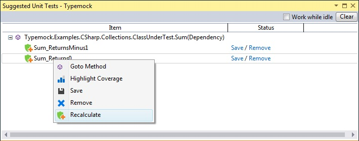 • When you want different automatically suggested test or your code has changed, right-click on the test name, and in the context menu click Recalculate to change the test.