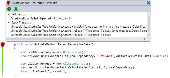 The code of the method is opened. In addition, the shield and the Test Preview window are displayed. To snap the Test Preview window so you can always see both the test and the code you need to debug, detach the Test window from the Method window by dragging the Test Preview window and dropping it somewhere on the screen.