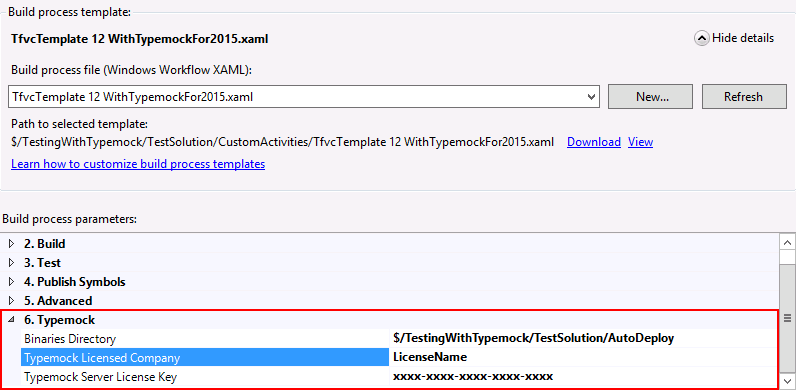 3. In the Build process template, set the AutoDeploy Path field to the source control path to the Typemock AutoDeploy directory.