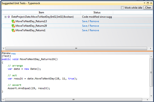 If you chose to suggest automatic tests when the computer is idle, Typemock Isolator creates tests during the specified inactivity period. After the tests are suggested, the Typemock Suggest window is displayed. Each test is accompanied with the icon that represents the status of the test: