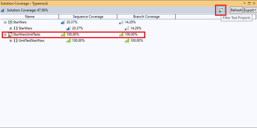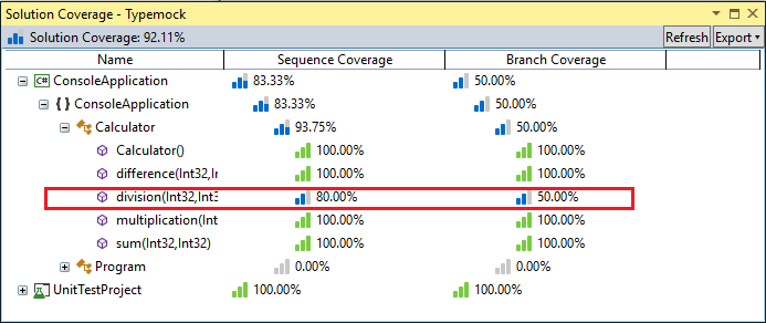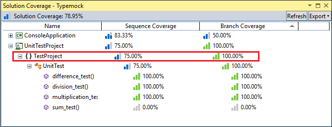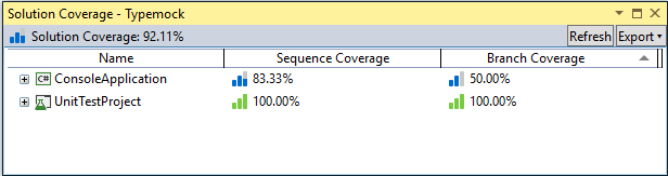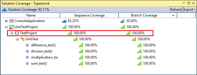 In the screenshot above there are only 4 tests which were all passed. Therefore, 100% is displayed in both the Sequence Coverage column and the Branch Coverage column next to the test project (named UnitTest).