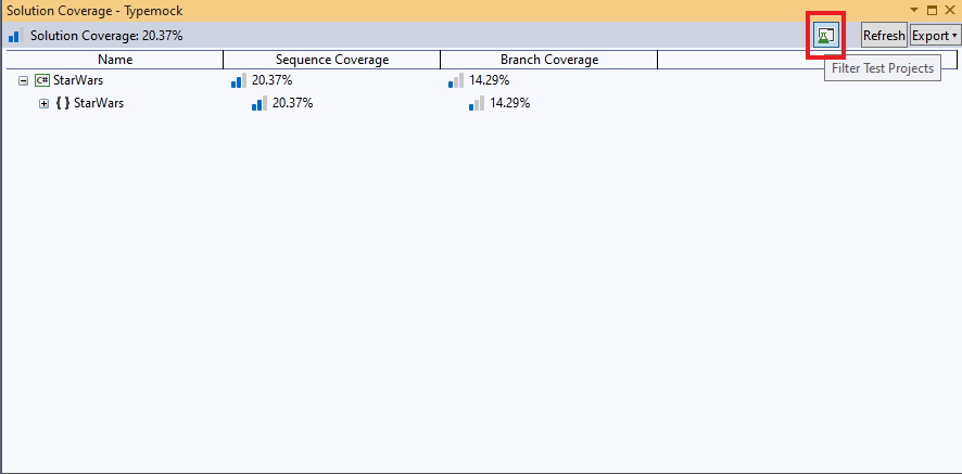 Solution Coverage –shows the weighted average between the Test project coverage and the Codebase project coverage in the upper left corner of the window.