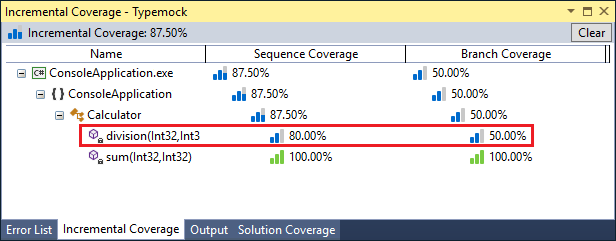 The Incremental Coverage window allows you to view your code coverage in real time while you are coding. It dynamically shows the coverage for all classes in which you made the last 100 changes. Every time you make a change, the Incremental Coverage is automatically updated.