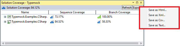Export your Coverage report – you can export your Coverage information directly from the Coverage window in Visual Studio. It can be exported in 4 formats as shown below: